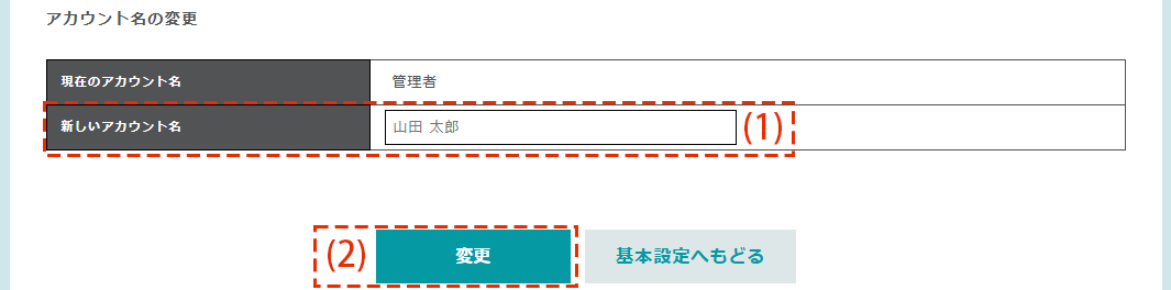 | (2)変更 | 新しく設定するアカウント名の入力が完了したら「変更」ボタンを押してください。 「変更」ボタンを押すと、アカウント名の変更が完了します。 |