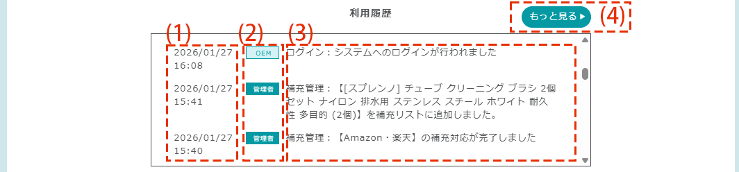 | (2)利用者 | 誰(管理者・OEM・倉庫)が利用したかが表示されます。 |