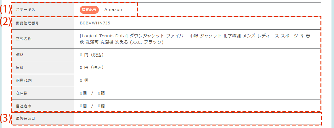 | (1)ステータス | 補充ステータス(補充必要・不要・済み)を確認できます。 モール名が表示されます。 |