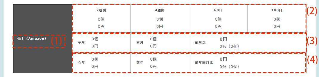 | (2)売上(期間別) | 売上を期間別(2週間、4週間、60日、180日)に確認できます。 |