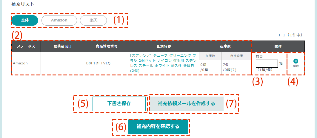 | (4)削除 | 「削除」ボタンを押すと、補充リストから削除されます。(商品一覧ページに表示されるステータスが、「補充必要」に戻ります。) |