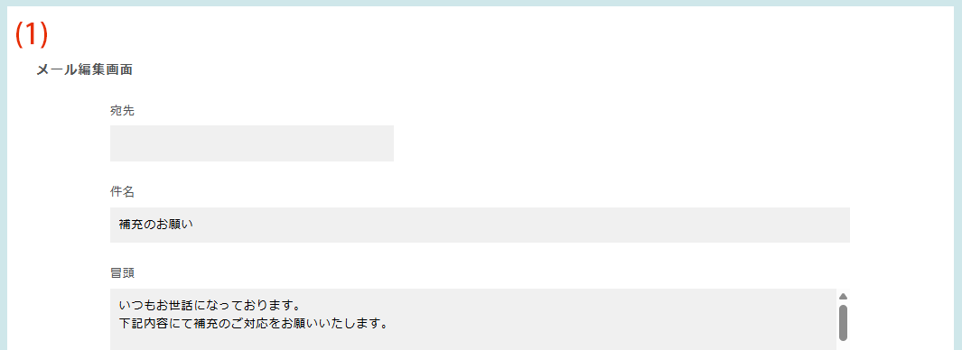 | (7)補充依頼メールを作成する | 補充の詳細をメールをで送る場合は、「補充依頼メールを作成する」ボタンを押してメール編集画面へ移ります。 |