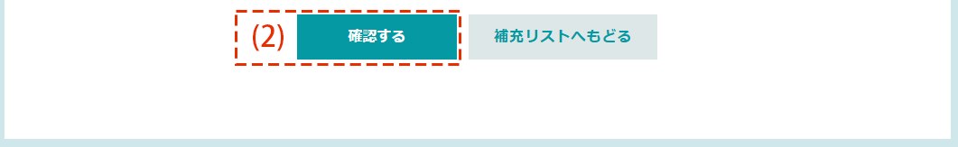 | (6)補充内容を確認する | 補充数量の入力が完了したら「補充内容を確認する」ボタンを押して、入力内容を確認してください。 内容に間違いが無ければ、「補充対応をする」ボタンを押して補充対応を完了します。 内容を修正する場合は、「補充リストへもどる」ボタンを押します。 |