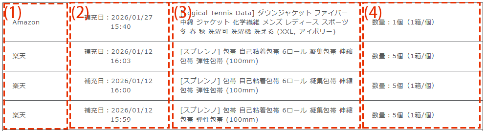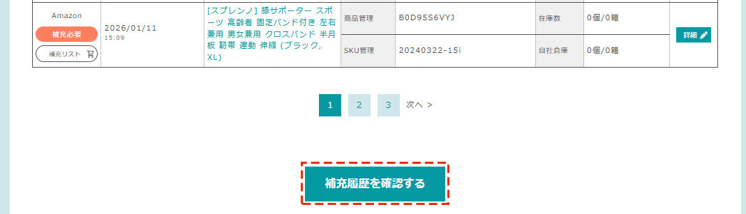 補充管理>商品一覧ページ下部にある「補充履歴を確認する」ボタンを押すと、補充履歴ページを開けます。