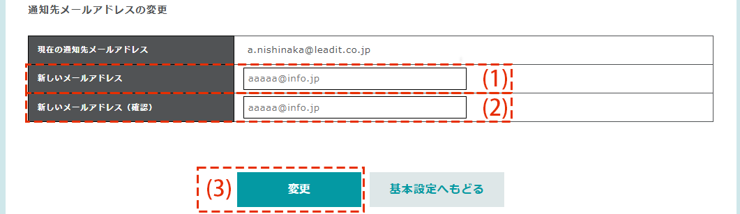 | (3)変更 | 新しく設定するメールアドレスの入力が完了したら「変更」ボタンを押してください。 「変更」ボタンを押すと、変更が完了します。 |