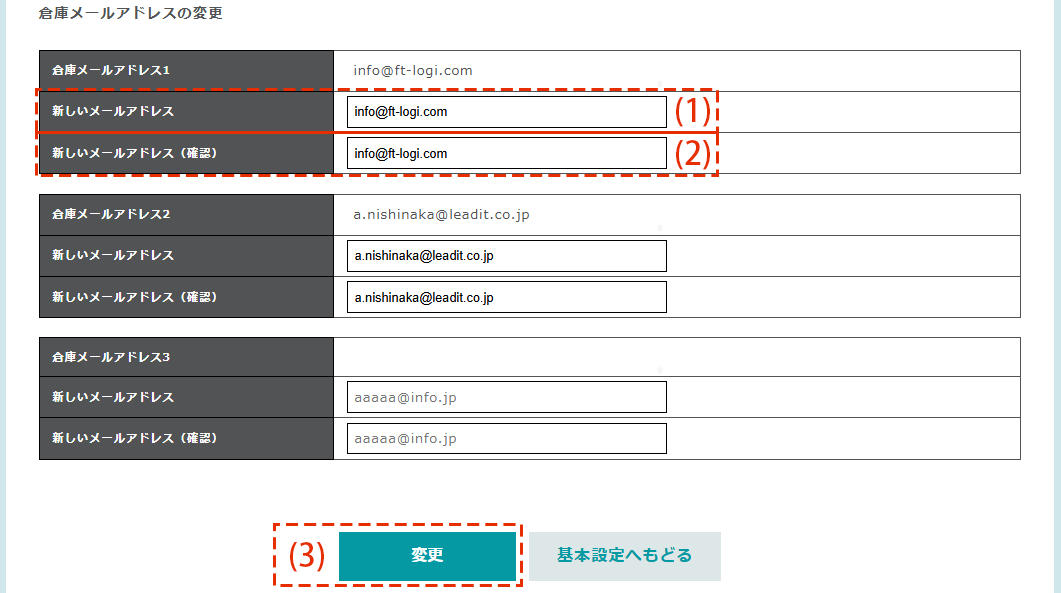 補充依頼メールの送信先メールアドレスを変更できます。倉庫アドレスは最大3件まで登録可能です。